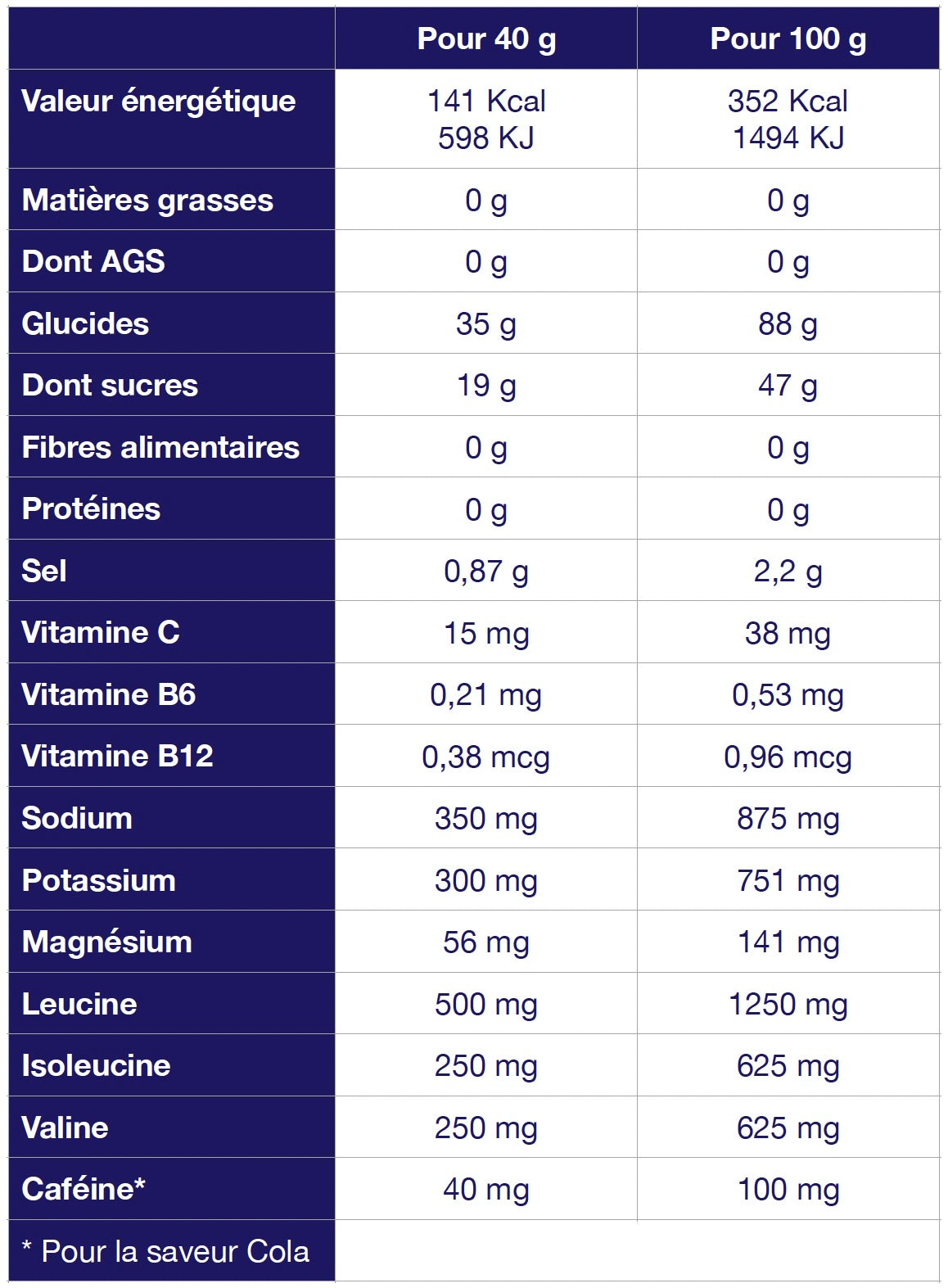 Maltodextrine, sucre pure de canne, poudre d'eau de coco déshydratée titrée en potassium, acides aminés branchés (dont émulsifiant : lécithine de tournesol) : L-leucine, L-isoleucine, L-valine, sel, acidifiant : acide citrique, citrate de magnésium marin, arôme naturel de citron, poudre de jus d'acérola déshydraté titré en vitamine C, vitamine B12 (cyanocobalamine) et vitamine B6 (chlorhydrate de pyridoxine).